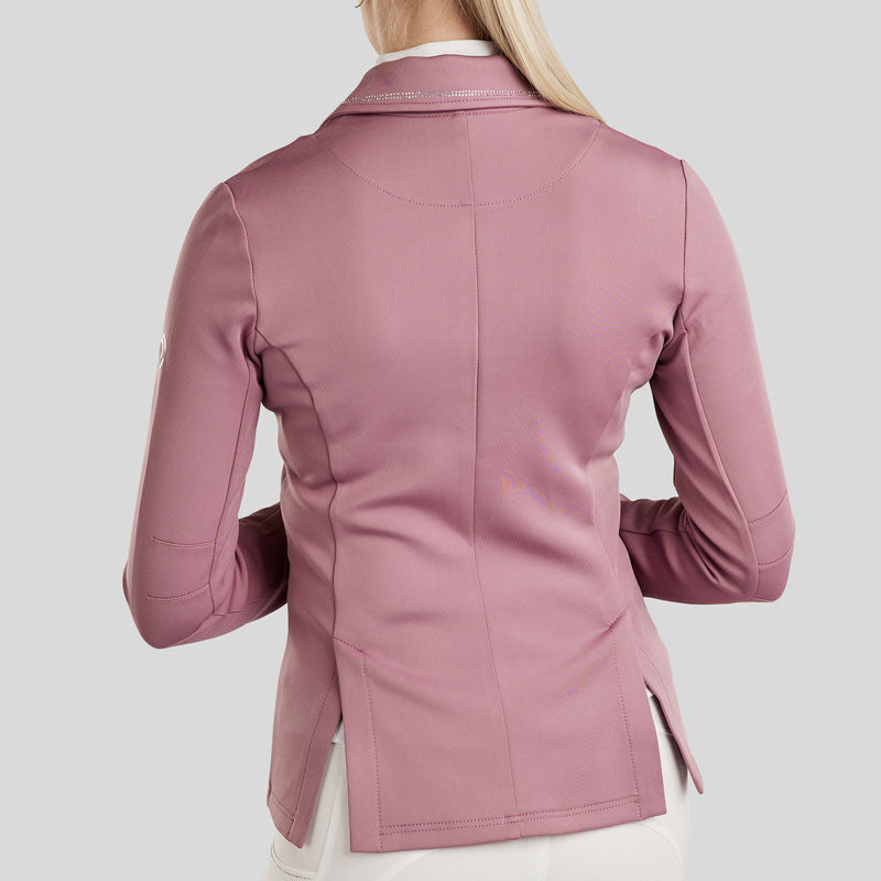Montar MoCha Geranie competition jacket for women. This striking riding jacket from the Montar collection features decorative flap pockets at the front and a double vent at the back. The jacket is finished with hologram-effect crystal details along the collar and on the flap pockets. The left sleeve also features the Montar logo in a hologram effect.
